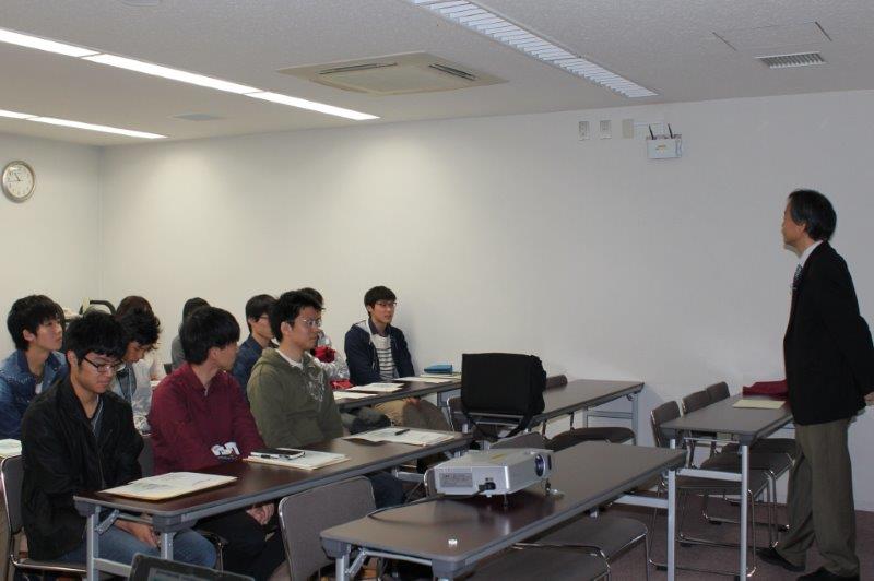 生命科学科の履修解説は2階の会議室で行われました。康生命科学科長より歓迎の挨拶後、引き続き履修解説がなされました。その後、出身地や当学科への志望理由、将来の目標などを順に新入生に尋ね、それに答える形で新入生自己紹介がされました。大半の学生が研究者を目指しており、当生命科学科が医学部にある生命科学科であることや、早期に研究を始められることを魅力に感じ入学していました。免疫系、遺伝子、がんや再生医療など、興味のある研究テーマは多様ですが、康生命科学科長はそれぞれに九大医学研究院の研究室の話も交え助言されました。