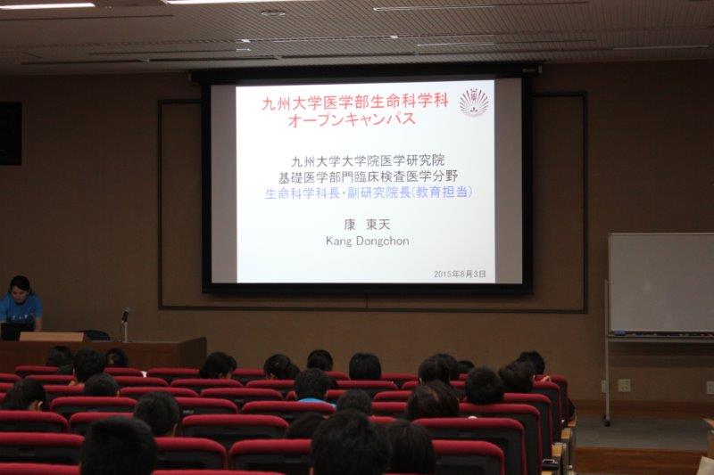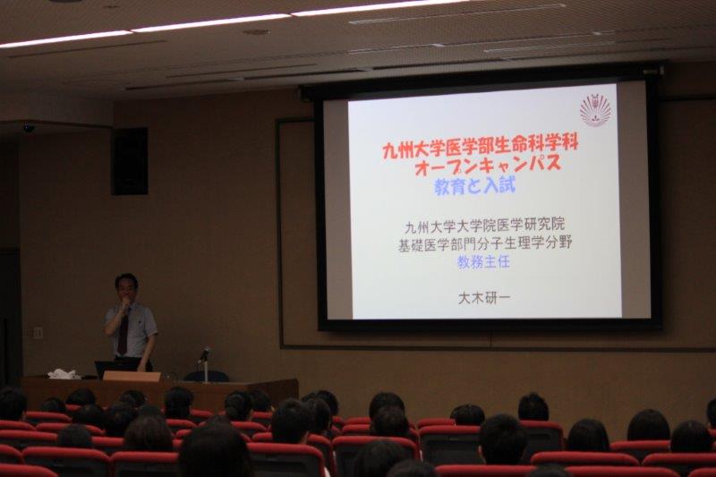 次に、生命科学科教務主任の大木研一教授から、九州大学の基幹教育や、生命科学科独自の専門教育科目等のカリキュラムについて説明がありました。当学科では、1年生で基幹教育科目を伊都キャンパスで学び、2年次より専門教育科目を病院キャンパスにて学びます。2年次では医学科と共通の基礎医学を学び、3年次では生命科学科独自の授業と並行して「早期研究室配属」として研究室に配属され、研究活動に触れることとなります。さらに4年次では卒業研究の形で個別の課題に挑戦します。また、民間の研究機関の見学を行うなどの研究を重視した特徴的な教育システムについてわかりやすく説明をされました。