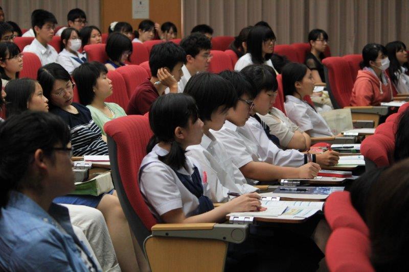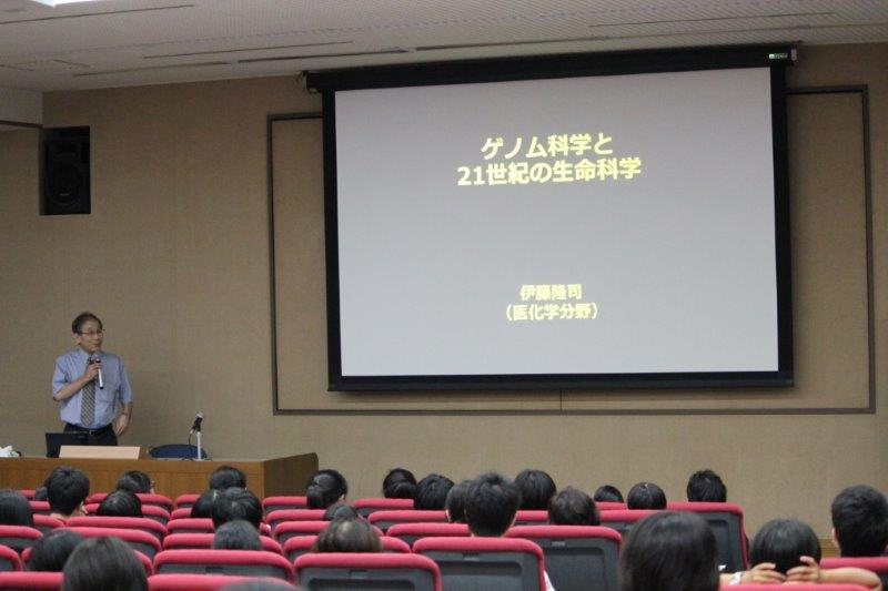 次いで、医化学分野の伊藤隆司教授による、「ゲノム科学と21世紀の生命科学」と題した講話がありました。伊藤教授は研究者を目指し医学部に入学したご自身の経験も交えながら、ゲノム科学についての説明をし、参加した約150名の皆さんが、熱心に聞き入っていました。