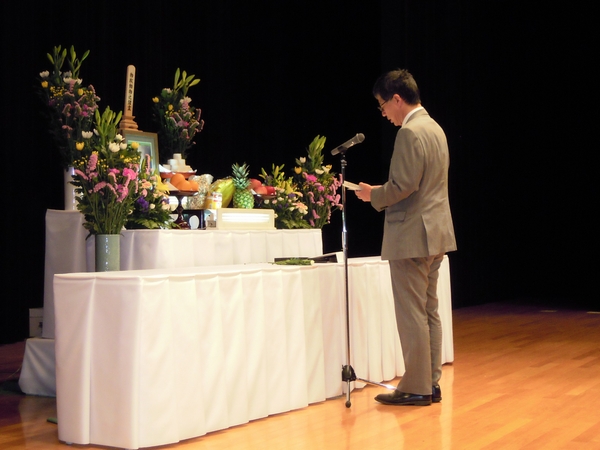 約300名の教職員・学生が参列し、始めに参加者全員で黙祷を行った後、住本研究院長から「慰霊の言葉」が述べられました。引き続き、小野動物実験施設長から弔辞があり、動物実験施設長は「今後とも、動物実験に従事する私達は、国内外の規制の動向や科学的知見に関する情報の収集に努め、3R(代替法の選択、使用数の削減、苦痛の軽減)を実行し、実験動物の福祉の実現に取組む所存である。」と述べられました。