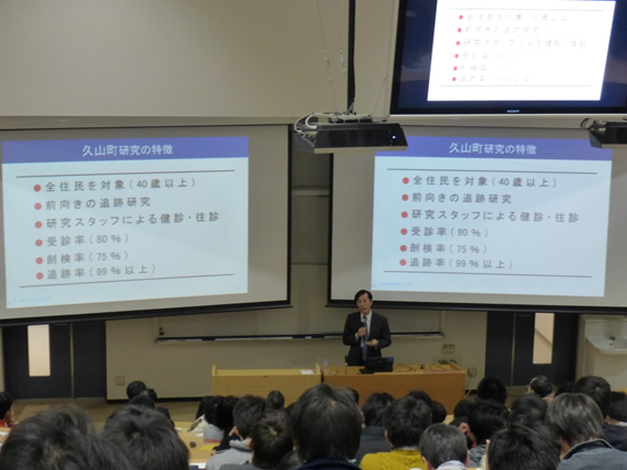最終講義は、「日本人の生活習慣病の時代的変化と今日の課題 ~久山町研究からのメッセージ~」というテーマで久山町研究を研究内容に加えて、住民の追跡調査の苦労話を交えながら、学生にわかりやすく講義されました。久山町研究は55年前に脳卒中の実態調査として始まりました。その後この半世紀の間に虚血性心疾患、高血圧、代謝性疾患、メタボリックシンドローム、認知症へと研究テーマが広がり、社会の要求に先駆けて研究成果を発表されています。久山町研究の特徴は40歳以上の全住民を対象として、前向きの追跡調査を行い、臨床医が行っている研究のため、健診のみならず、自宅訪問も行うために、発症者をより正確に把握できることだと述べられました。さらに、健診の受診率は80%を維持し、追跡調査の追跡率が99%以上で、これまで追跡不能となったのはわずかに3名という驚異的な追跡率を維持する久山町研究スタッフの努力と協力して下さる久山町の保健師さんや住民のみなさんに深く感謝の意を表されたことが印象的でした。