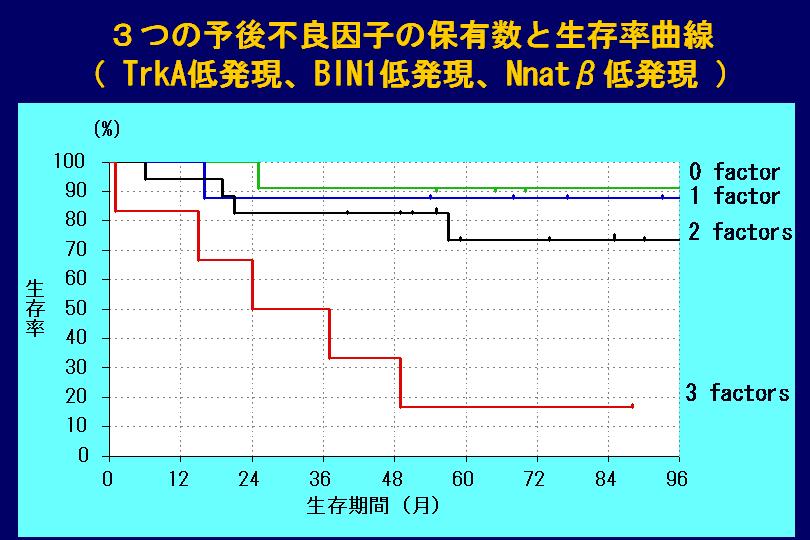 さらに、神経芽腫の悪性度に関わる遺伝子発現に着目した。すでにTrkAという遺伝子発現の関与は分かっているが、新たにBIN1遺伝子とNnatβ遺伝子の2つの遺伝子発現と神経芽腫悪性度との関与を初めて明らかにした。この2つの遺伝子はいずれも遺伝子発現量が低いほど神経芽腫の悪性度が高い、つまり生存率が低いことをつかんだ。さらに、TrkAを含めた3つの遺伝子の低発現をそれぞれ予後不良因子としたとき、それぞれの腫瘍が保有する3つの予後不良因子の数が多いほど悪性度が高く、生存率が低かった。(左グラフ参)。