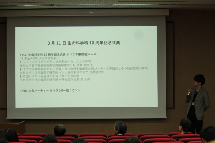 平成19年4月1日に設置されました生命科学科は、平成29年4月に10周年を迎えます。これを記念し、現在学部3年生である8期生が中心となり、学生主体による『生命科学科10周年記念式典』が3月11日(土)、コラボステーションⅠ・Ⅱにて開催されました。