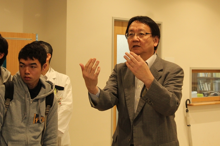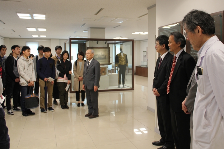 履修解説の後は、再び大ホールにおいて、医学学生係長から医学部在学中の注意事項等が、医学部同窓会から同窓会についての紹介があり、その後、病院キャンパス見学ツアーが催され、グループに分かれ実際にキャンパス内を歩き、教員からキャンパス内の歴史的名所や施設についての説明を受けました。