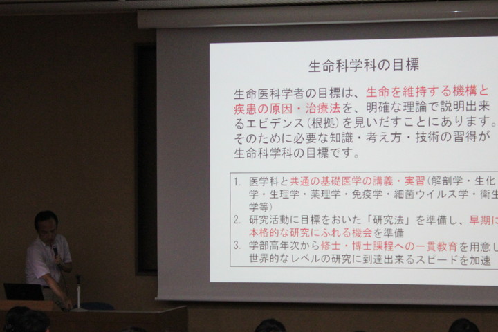 説明会では、はじめに康東天生命科学科長から、挨拶ならびに生命科学科の概要についての紹介がありました。康生命科学科長は、生命科学が日本の産業の柱になることを期待されているとの話をされ、当学科の特徴ある教育システムについても話されました。