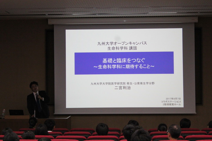 次いで、衛生・公衆衛生学分野 二宮利治教授による、「基礎と臨床をつなぐ~生命科学科に期待すること~」と題した講話がありました。 二宮教授は、博士号を基礎研究である免疫研究で授与されながらも、現在は、臨床研究である疫学研究に携わられています。講話では、一般に動物や細胞、組織を対象に深く研究を行いメカニズムを解明する基礎医学研究と、基礎医学研究で得られた知見をヒトに適応する場合の影響等を調べる臨床研究の違いや、現在の研究内容についても説明され、ご自身の経験の中から、基礎研究、臨床研究のこの2つの知識が、医学研究が人々に寄与するためにとても重要であると感じられことや、その上で生命科学科の学生に期待することを話されました。