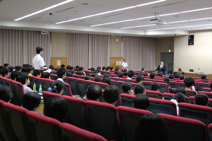 次に、生命科学科教務主任の神野尚三教授から、九州大学の基幹教育や、生命科学科独自の専門教育科目等のカリキュラムについて説明がありました。当学科では、1年次で基幹教育科目を伊都キャンパスで学び、2年次より専門教育科目を病院キャンパスにて学びます。2年次では医学科と共通の基礎医学を学び、3年次では生命科学科独自の授業と並行して、「研究室配属」として研究室に配属され研究活動に触れることとなります。さらに4年次では卒業研究の形で個別の課題に挑戦するなどの研究を重視した特長的な教育システムを行っており、神野教授はそれぞれについてわかりやすく説明をされました。
