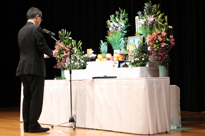 約260名の教職員・学生が参列し、始めに参加者全員で黙祷を行った後、住本研究院長から「慰霊の言葉」が述べられました。引き続き、小野動物実験施設長から弔辞があり、動物実験施設長は「今後とも、動物実験に従事する私達は、国内外の規制の動向や科学的知見に関する情報の収集に努め、3R(代替法の選択、使用数の削減、 苦痛の軽減)と実験動物学の三大統御(環境統御、微生物統御、遺伝統御)を実践することで、 実験動物の福祉の実現と動物実験の再現性確保に取組む所存である。」と述べられました。