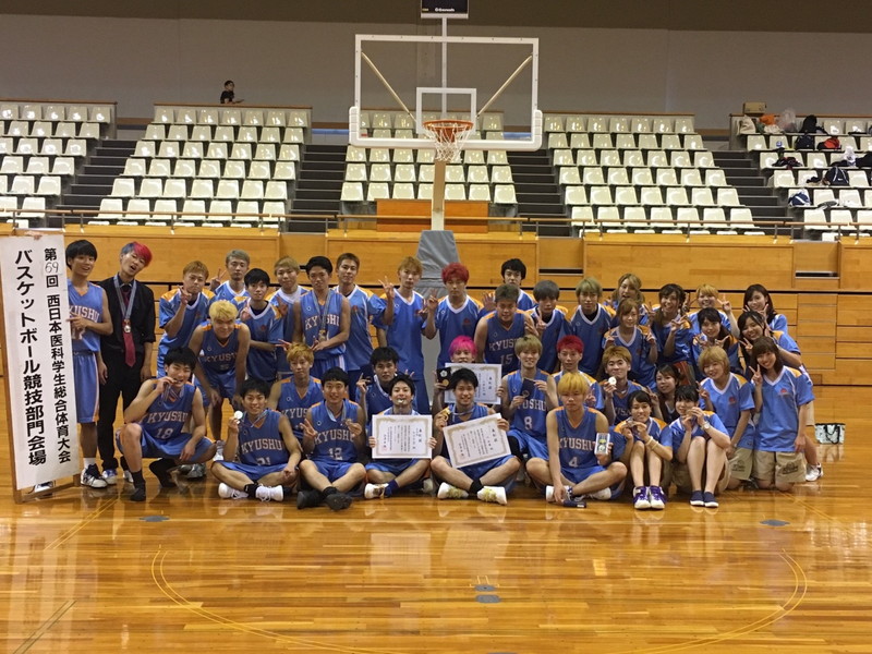 第69回西医体を迎えるにあたって、医学部バスケットボール部は、昨年の西医体で得た準優勝という結果を超えるべく練習をしてきました。しかし、春の九州山口医科学生体育大会において3位に終わるなど、実力がありながらもなかなか勝ちきれない時期もあり、自信の中に不安も残しながら大会を迎えることになりました。本大会が始まると、チームは好調で比較的快勝のもとに準決勝まで駒を進めました。そして、準決勝では九山内最大のライバルとも言える鹿児島大学に勝利し、2年連続の決勝進出を決めました。決勝は2年前の準優勝校である富山大学との対戦となりました。決勝では疲労と緊張が見られるものの前半を6点リードで折り返します。しかし、後半になると相手のシュートが決まり出し、残り5分で逆転を許します。最後はこちらも反撃しましたが1点及ばず、67-68で2年連続の準優勝となりました。また個人賞として久岡(3年)がベスト5、北(6年)がMDP(Most Defensive Player)に選出されました。